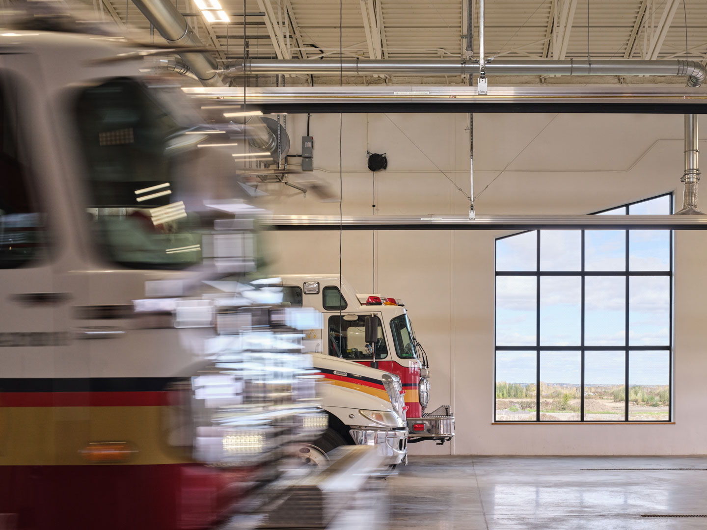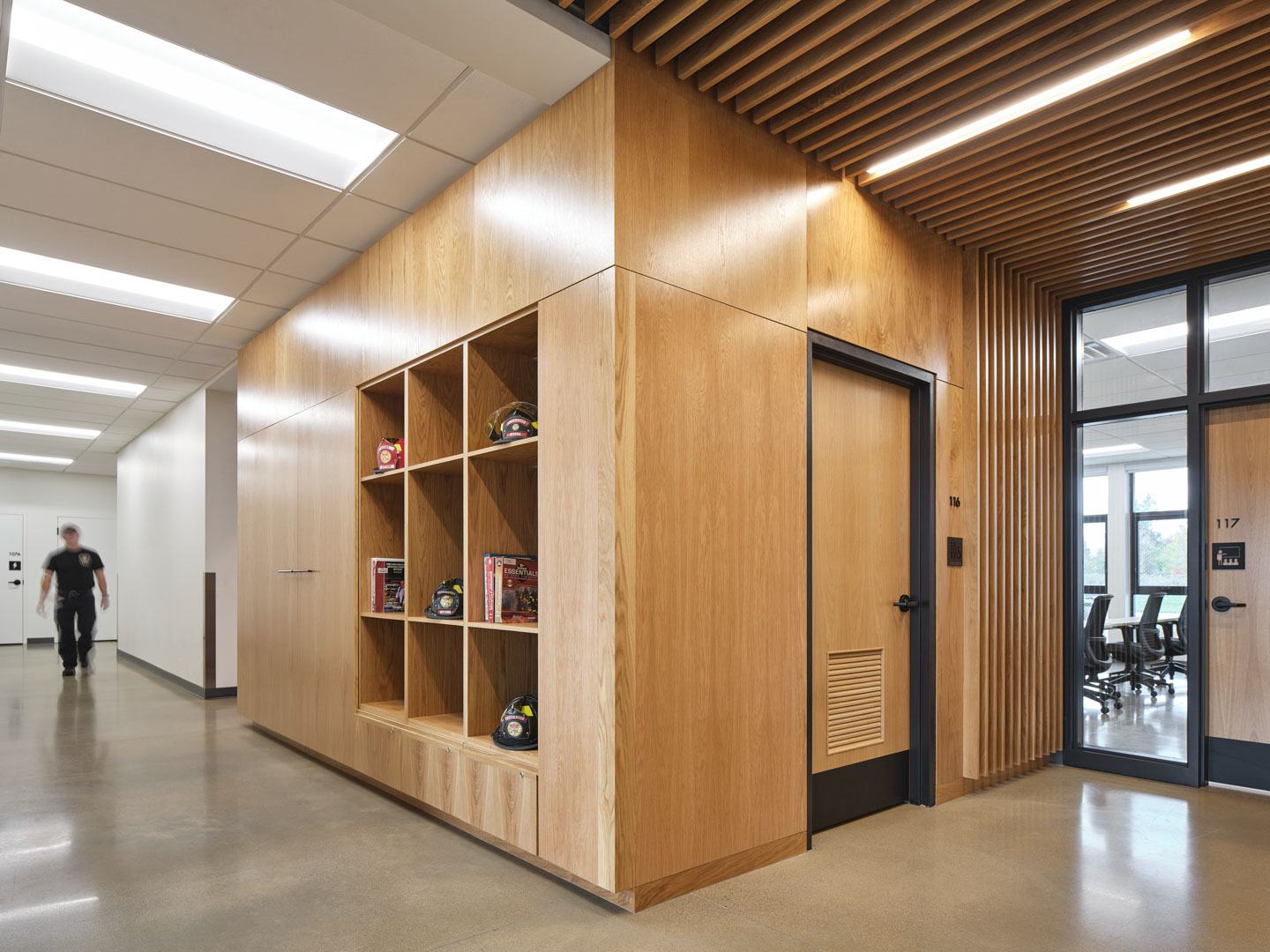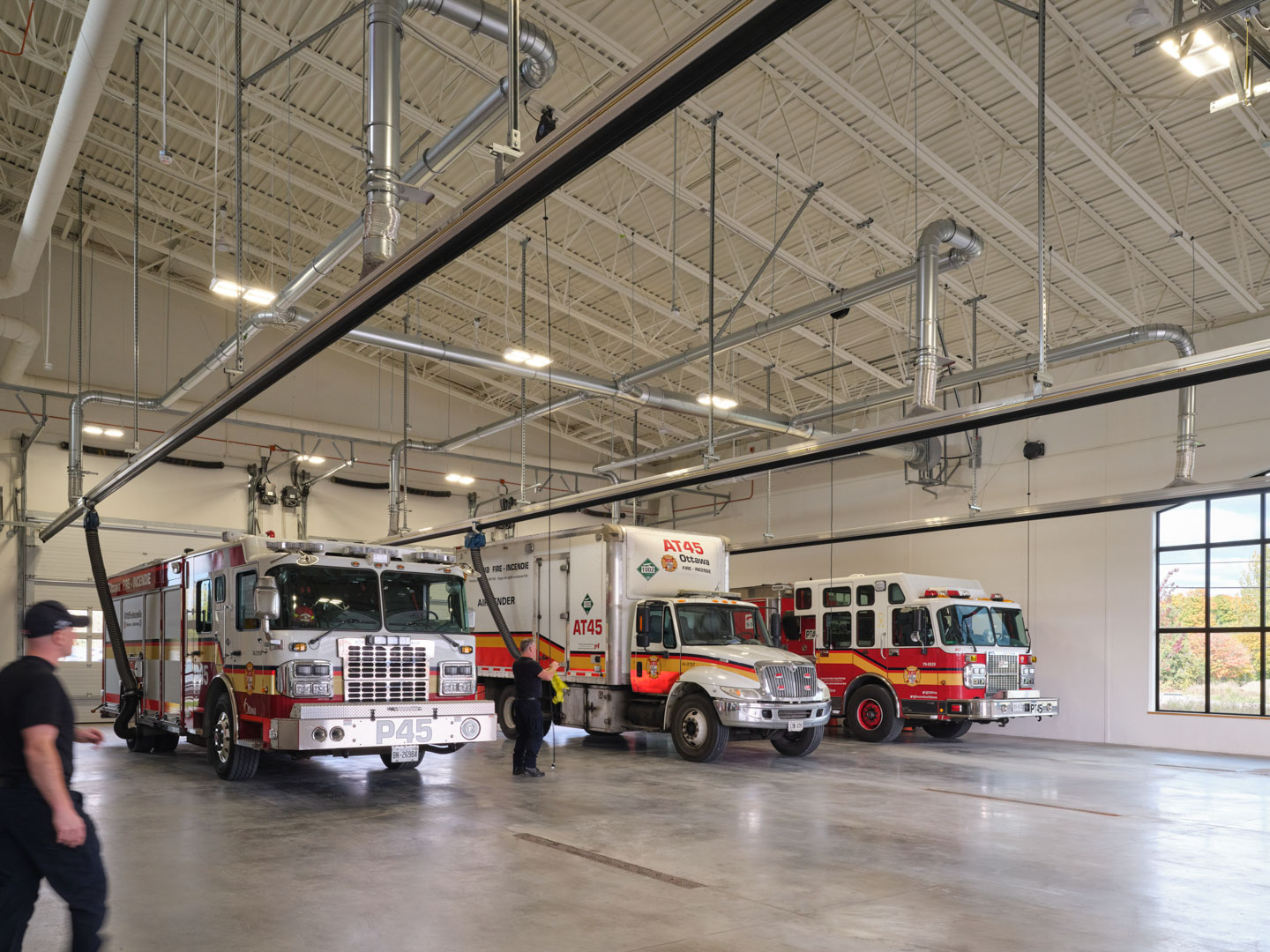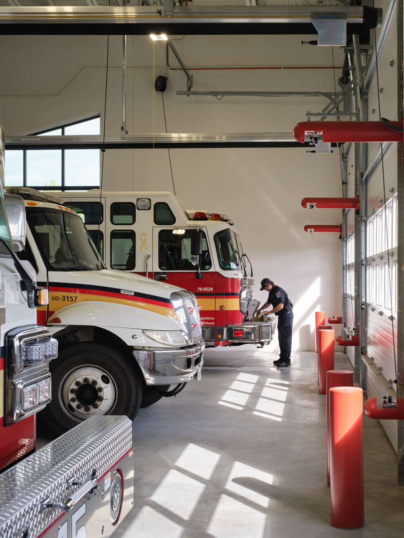 The station’s design maximizes the functionality of all the program spaces through adjacencies and articulation to enhance the private, shared and specialized spaces. The layout and interior design both respond to the needs of a user group who occupy and reside on-site for extended periods of time. The new building includes an apparatus bay for trucks, platoon rooms, fitness area, bunker gear room and watch room.