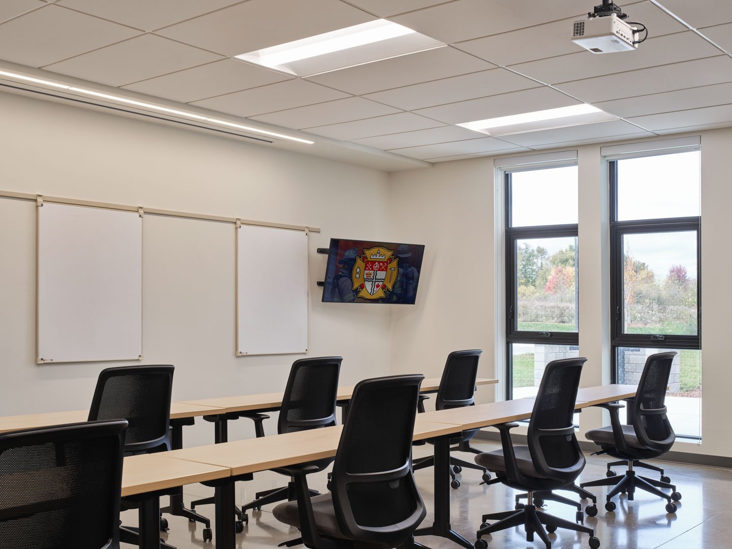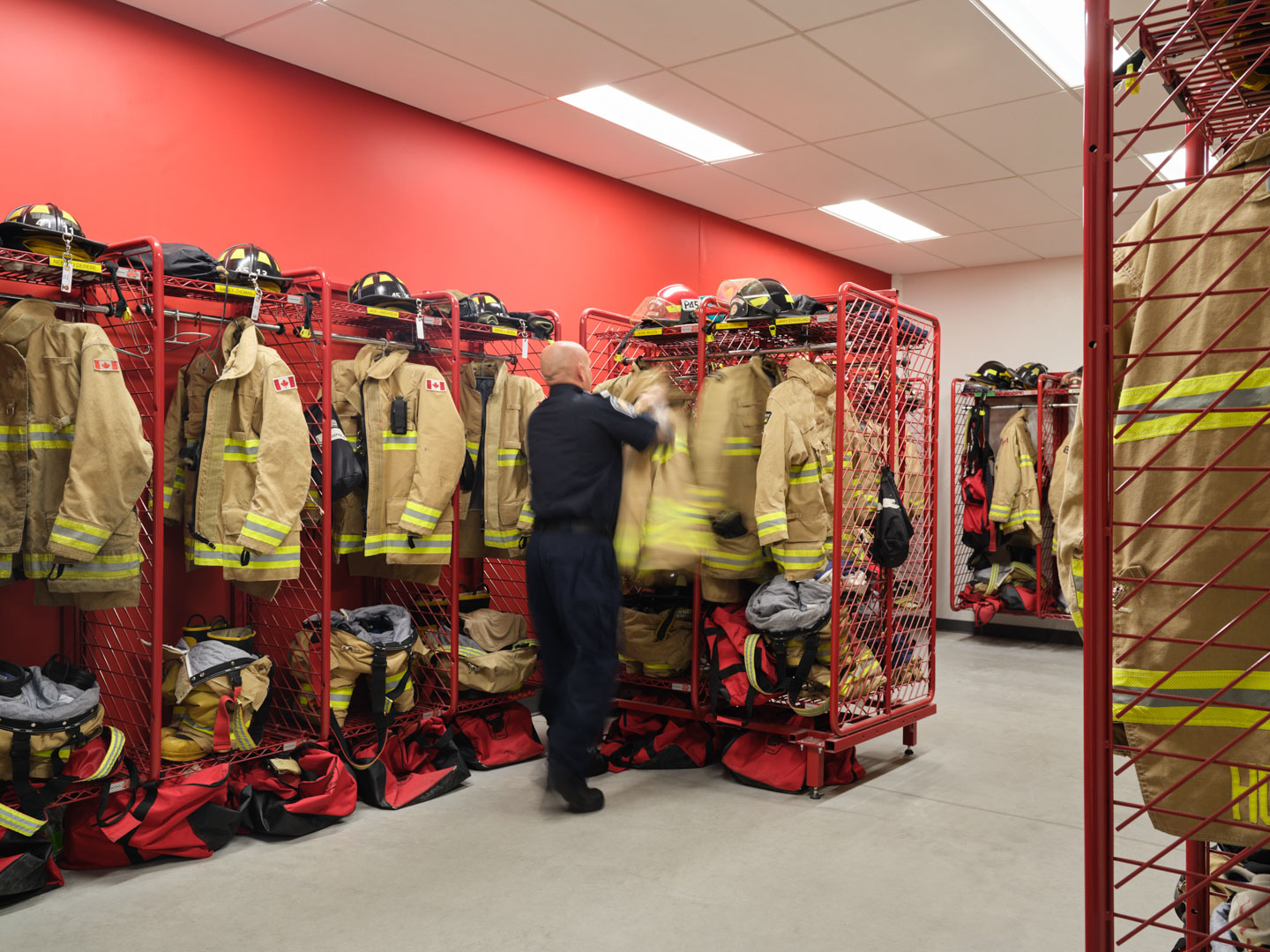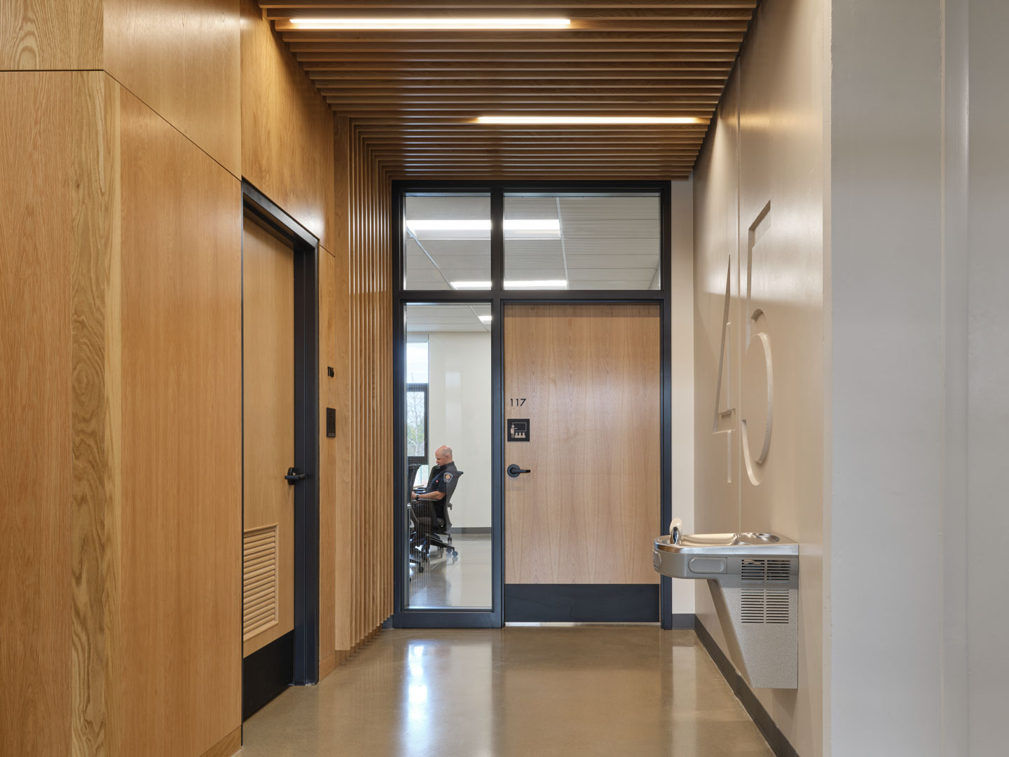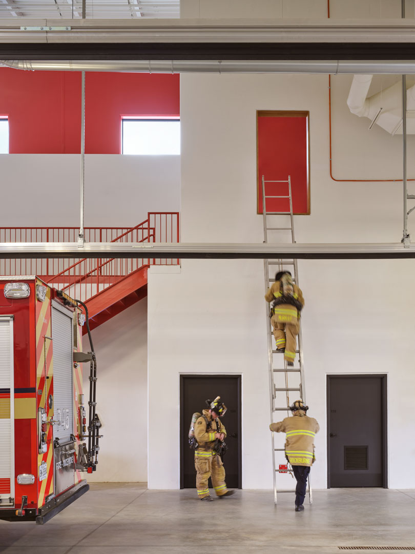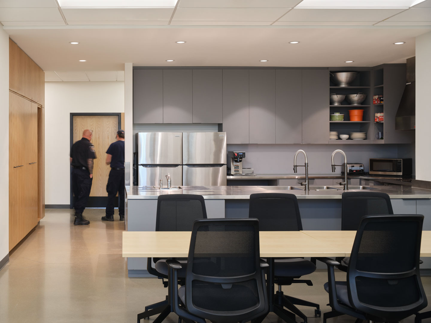 The station’s design maximizes the functionality of all the program spaces through adjacencies and articulation to enhance the private, shared and specialized spaces. The layout and interior design both respond to the needs of a user group who occupy and reside on-site for extended periods of time. The new building includes an apparatus bay for trucks, platoon rooms, fitness area, bunker gear room and watch room.