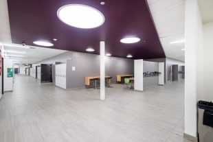 The two-storey, 158,500 sq. ft. steel and masonry building has the capacity for 1,460 students (860 elementary and 600 secondary). The layout of the building is broken down into four pieces. The largest piece is the gym, which can be subdivided into four gyms, and is surrounded on both storeys with a single loaded corridor. Each corridor has accent colours used on doors and wayfinding to act as queueing for students of all ages. The second piece is the Central Commons which includes Central Administration, Cafeteria and the Media Centre. The third piece is the kindergarten zone which has its own corridor that links the bus access to its own secure playground. The fourth includes teaching and collaboration spaces.